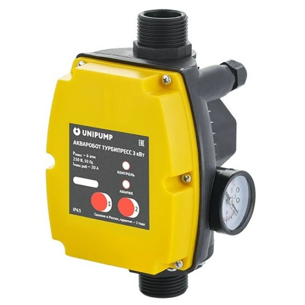 Блок управления насосом UNIPUMP ТУРБИПРЕСС 3 70276 Блок АКВАРОБОТ ТУРБИПРЕСС — предназначен для автоматического управления однофазными поверхностными и погружными насосами. Усовершенствованный нашими конструкторами, с учетом отзывов наших клиентов, блок «АКВАРОБОТ ТУРБИПРЕСС» получил функциональные возможности: автоматическое управление работой насоса, поддерживая давление в системе водоснабжения между заданными пользователем порогами; защита насоса от работы в режиме "сухого хода" и осуществление серии пробных пусков для выхода из режима аварии; автоматическое выключение насоса, если он не может создать давление верхнего порога при отсутствии потока воды; защита системы водоснабжения от давления более 6 бар в режиме настройки порогов давления; стабильная работа при пониженном напряжении.