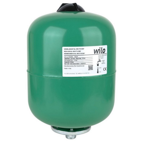 Мембранный бак Wilo WB 24L 10B G1" S 2791272 - мембранный расширительный бак, представляет собой емкость из металла, окрашенный снаружи эмалью. Внутри бака находится мембрана или мембранная емкость из этиленпропиленового каучука (EPDM). Мембрана разделяет бак на воздушную и водонаполненную полость. Подсоединение к водонаполненной полости осуществляется через резьбовое соединение. Воздушная полость имеет ниппель для закачки воздуха. Мембранные расширительные баки Wilo WB универсальные и применяются в системах водоснабжения, пожаротушения, установках повышения давления, в системах отопления, для компенсации температурного расширения, снижения гидроударов в системах и для накопления дополнительного объёма воды.